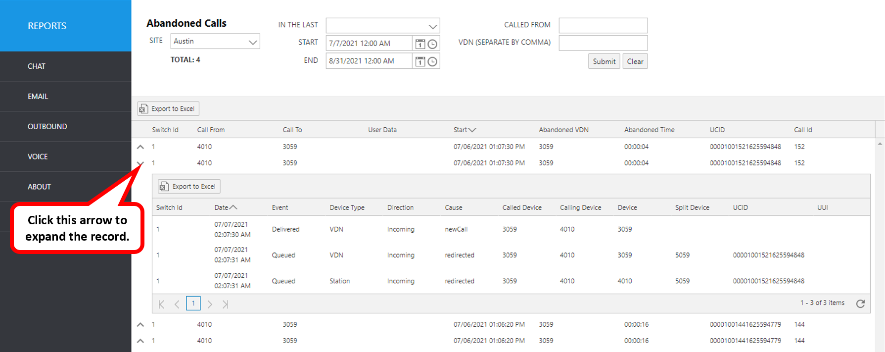 The Abandoned Calls Report shows call details for any calls that were abandoned within the selected criteria. The initial results will show summary data, and the report can be expanded to show additional detail.