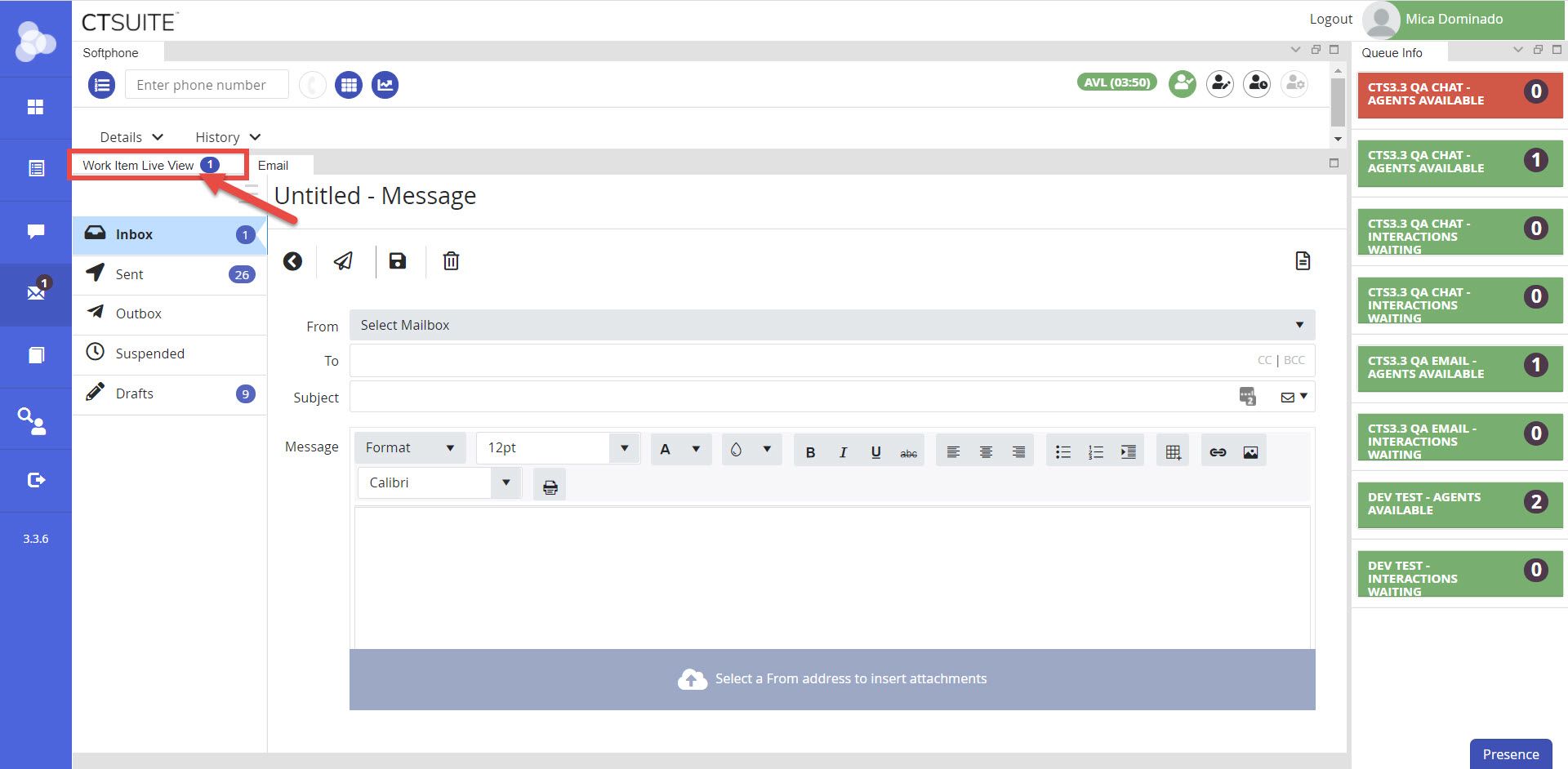 The Work Item Live View tab remains visible in the dashboard while agent is navigating to other widgets.
