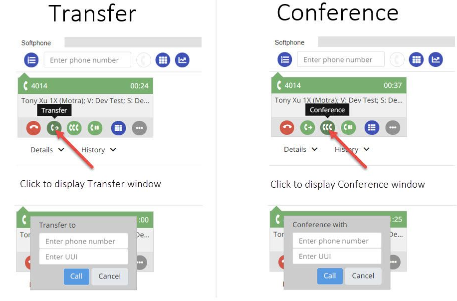 With a call in progress, click on either the Transfer or Conference button. Once clicked, a form will appear where you will enter the phone number you wish to transfer to or conference with. You can also enter the UUI if applicable. Click the Call button to dial the number.
