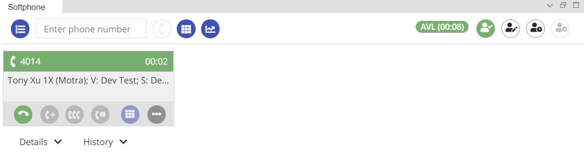 Calls in progress appear as a tile within the softphone panel. The panel automatically resizes to display the active incoming or outbound call line appearance(s). If multiple calls are in progress, multiple tiles will display.